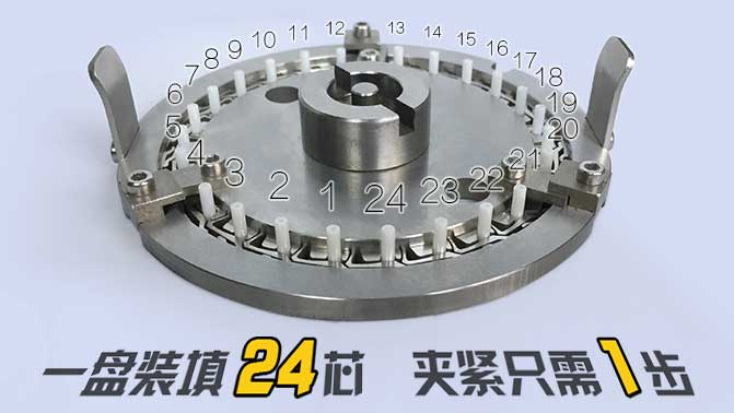 我们对传统的插芯夹具的装夹方式进行了重新设计,装填数量提升到了24个,通过相应的助具,每个加持位装填后,只需一个动作即可瞬间完成所有的插芯夹紧与等高操作。研磨完成后,也只需一个动作即可全部拆卸。